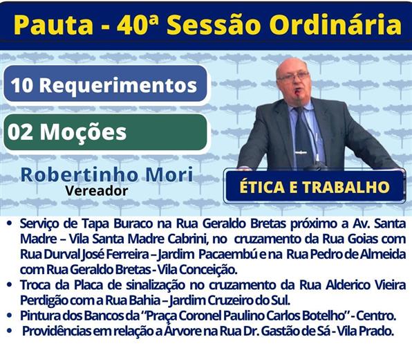 O vereador Robertinho Mori (União Brasil) apresentou moção de congratulações ao Coronel PM Jefferson Jorge Lopes pelo trabalho realizado durante sua trajetória na Polícia Militar. O documento, aprovado na sessão plenária desta quarta-feira (16), enaltece a trajetória do policial e o cumprimenta “pela dedicação e bravura durante os anos de trabalho na Polícia Militar, agradecendo e reconhecendo todo empenho”.