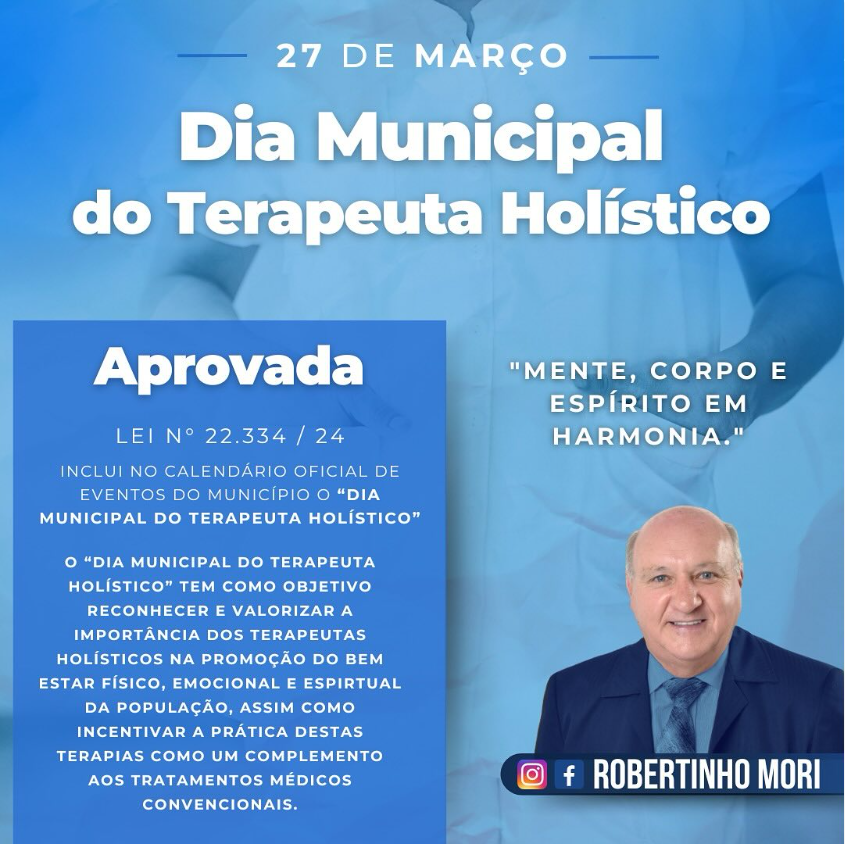 O “Dia Municipal do Terapeuta Holístico” tem como objetivo reconhecer e valorizar a importância dos Terapeutas Holísticos na promoção do bem estar físico, emocional e espiritual da população, assim como incentivar a prática destas terapias como um complemento aos tratamentos médicos convencionais.