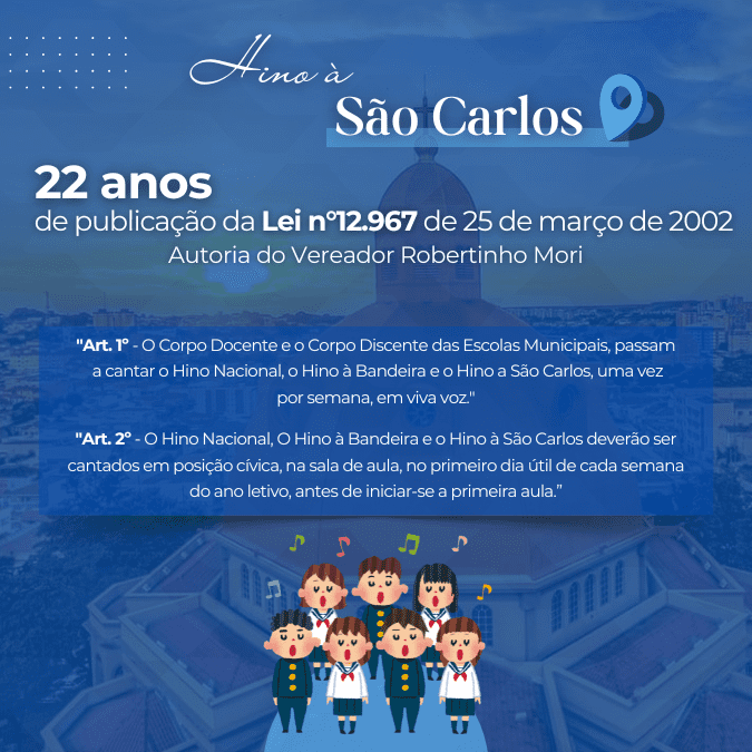 22 anos de publicação da Lei nº 12.967 de março de 2002, de minha autoria, em que o Hino à São Carlos deverá ser cantado nas escolas. Deixo aqui o histórico do Hino.