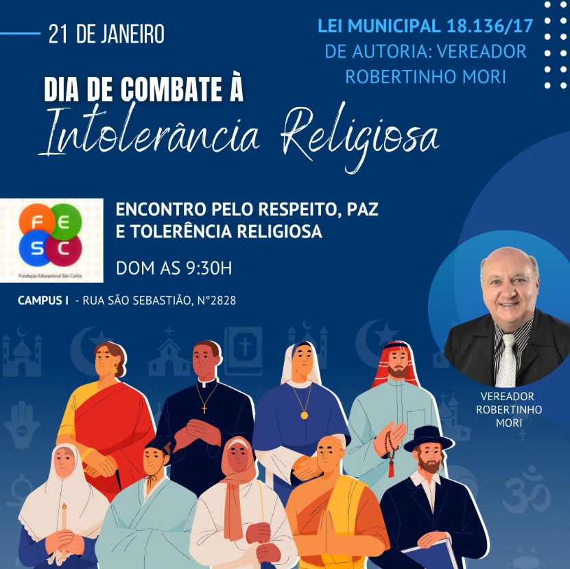Em celebração a Lei Municipal 18.136/17 de Combate à Intolerância Religiosa, autoria do vereador Robertinho Mori, convidamos você para um Encontro pelo Respeito, Paz e Tolerância Religiosa na FESC Campus I (rua São Sebastião, n°2828) dia 21 de Janeiro (domingo), as 9:30h.