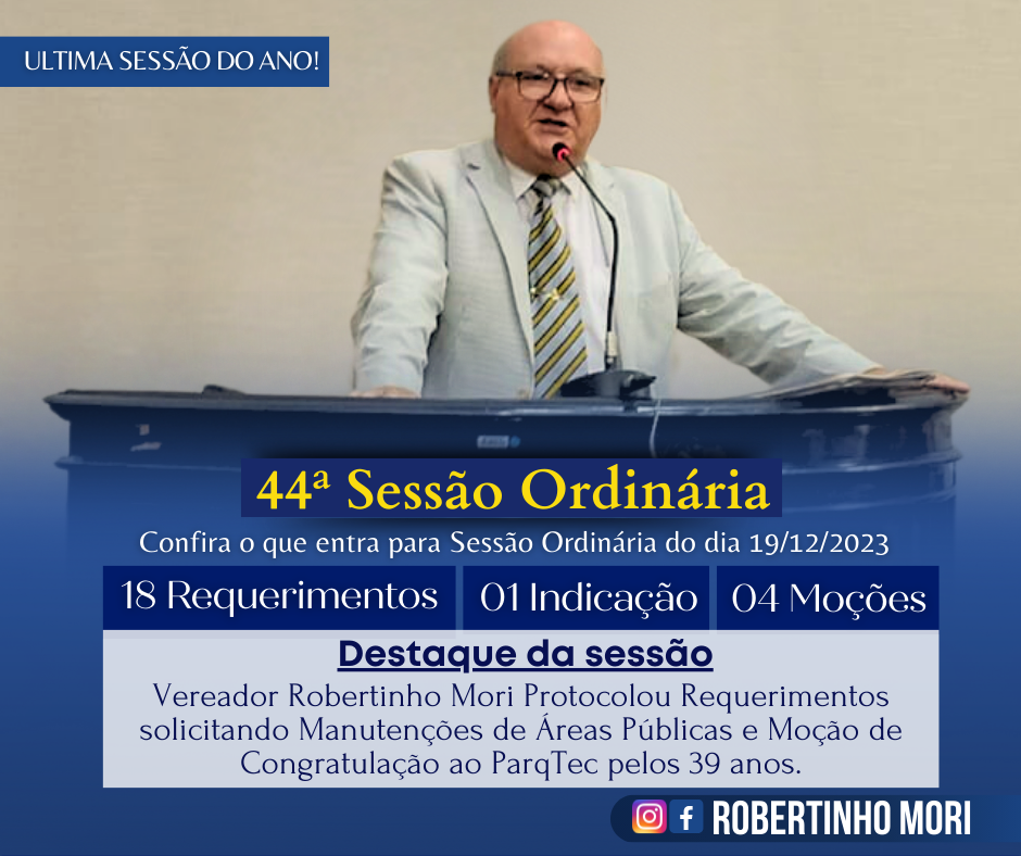 Destaque da sessão: Vereador Robertinho Mori protocolou requerimentos solicitando manutenções de áreas públicas e moção de congratulação ao ParqTec pelos 39 anos.