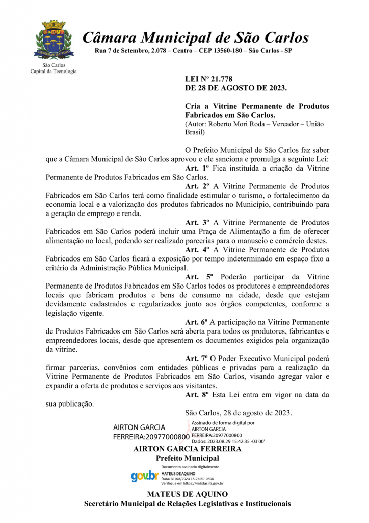 O trabalho do vereador  aplicado ao projeto, que iniciou em 2013. Em conversa informal no primeiro mandato do Prefeito Airton Garcia, ele apoiou a ideia e colocou-se a disposição. Em seguida, conversando com amigos, pesquisando empresas e analisando dados, criou-se a Lei Municipal 21.778 de 28 de agosto de 2023 da Vitrine Permanente de Produtos fabricados em São Carlos, com a finalidade de estimular o turismo, o fortalecimento da economia local e a valorização dos produtos fabricados no Município.